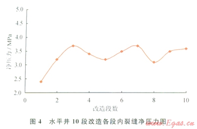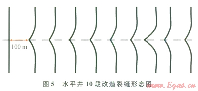 以某口致密儲層X水平井為例,水平段長度1043m,儲層有效孔隙度8%,有效滲透率0.12mD,地層孔隙壓力29.0MPa,楊氏模量25000MPa,泊松比0.2,最小水平主應(yīng)力43.2 MPa,抗張強度3.5MPa。分段改造設(shè)計6~10段。利用上述數(shù)學(xué)模型計算水平井10段改造下不同段內(nèi)的凈壓力及裂縫形態(tài)表明:100m的段間距內(nèi)裂縫將發(fā)牛轉(zhuǎn)向(圖4、5)。