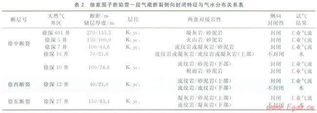 通過(guò)徐家圍子斷陷受三大斷裂遮擋的營(yíng)一段氣藏現(xiàn)今斷裂側(cè)向封閉性研究結(jié)果(表2)可以看出,如果錯(cuò)斷營(yíng)一段火山巖圈閉的斷裂兩盤是火山巖儲(chǔ)層與另一盤砂礫巖對(duì)接,由于砂礫巖壓實(shí)成巖程度相對(duì)較高,孔滲性差,可以對(duì)火山巖儲(chǔ)層形成側(cè)向封閉,則有利于天然氣聚集成藏,如徐中斷裂附近的徐深601井、徐深5井、徐深7井、徐深14井(上部)、徐深10井,徐西斷裂附近的徐深l2井(上部)和徐東斷裂附近的徐深27井(上部),營(yíng)一段皆為火山巖儲(chǔ)層與另一盤砂礫巖對(duì)接,斷層側(cè)向上封閉,有利于天然氣聚集成藏,天然氣鉆探皆為氣層。如果斷裂兩盤是火山巖與火山巖對(duì)接;斷層側(cè)向不封閉,不利于天然氣聚集成藏,如徐中斷裂附近的徐深14井(下部),徐西斷裂附近的徐深12井(下部)和徐東斷裂的徐深27井(下部),營(yíng)一段均屬于火山巖與火山巖對(duì)接,斷層側(cè)向不封閉,不利于天然氣聚集成藏,天然氣鉆探皆為水層。