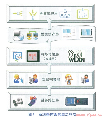 RFID可控閥門(mén)信息化系統(tǒng)整體架構(gòu)由設(shè)備感知層、數(shù)據(jù)完善層、網(wǎng)絡(luò)傳輸層、數(shù)據(jù)儲(chǔ)存層、決策管理層共5個(gè)層次構(gòu)成,系統(tǒng)整體架構(gòu)層次構(gòu)成見(jiàn)圖1。