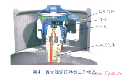 直立閥結(jié)構(gòu)見圖3,直立閥調(diào)壓器組工作狀態(tài)見圖4。與角閥相比,直立閥無外部手動(dòng)開關(guān),借助內(nèi)部彈簧與鋼瓶內(nèi)壓自動(dòng)關(guān)閉。直立閥通常處于自動(dòng)關(guān)閉狀態(tài),只有裝上調(diào)壓器,并打開開關(guān),直立閥才能開啟。