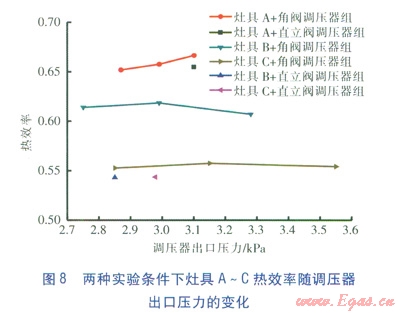 以直立閥鋼瓶作為氣源的實(shí)驗(yàn)方法為:選取鋼瓶內(nèi)壓為0.03MPa,進(jìn)行灶具熱效率實(shí)驗(yàn)。待灶具燃燒穩(wěn)定后,將盛裝一定水的鋁鍋放于灶具上,待水溫升至高于初始溫度5℃時(shí),開始攪拌,并計(jì)量燃?xì)夂牧俊4疁乇瘸跏紲囟雀?span lang="EN-US">30℃時(shí),關(guān)閉灶具。實(shí)驗(yàn)數(shù)據(jù)經(jīng)過計(jì)算,可以得到灶具的熱效率[3]。以角閥鋼瓶作為氣源的實(shí)驗(yàn)方法為:在LPG鋼瓶滿瓶條件下,分別將調(diào)壓器調(diào)至最大壓力(對(duì)應(yīng)調(diào)壓器最大刻度)、中間壓力、最小壓力(對(duì)應(yīng)調(diào)壓器最小刻度)進(jìn)行實(shí)驗(yàn),實(shí)驗(yàn)方法與以直立閥鋼瓶作為氣源的實(shí)驗(yàn)方法相同。兩種實(shí)驗(yàn)條件下灶具A~C熱效率隨調(diào)壓器出口壓力的變化見圖8。