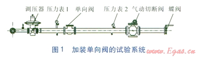 當用戶用氣設備突然停機,會造成調(diào)壓器出口管段內(nèi)壓力瞬間升高,其原因主要是用氣設備的切斷速度極快(切斷時間小于1s),而調(diào)壓器的閥口關(guān)閉速度慢(需3~4s),調(diào)壓器閥口關(guān)閉的響應時間比用戶用氣設備切斷閥的切斷時間長,造成用戶用氣設備切斷后,調(diào)壓器上游還有少量氣體輸送至下游,造成下游管段壓力瞬間升高。如何抑制調(diào)壓器出口壓力的突然上升?本文從在調(diào)壓器出口管段上加裝單向閥、加裝安全放散閥以及調(diào)整用戶端用氣設備控制閥門的關(guān)閉程序等3個方面進行試驗研究。