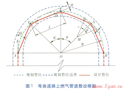 根據(jù)圓內(nèi)接多邊形基本理論,建立彎曲道路上燃?xì)夤艿婪笤O(shè)的數(shù)學(xué)模型為:
