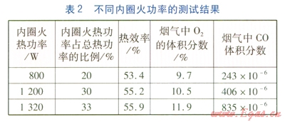 在燃燒器直徑一定的情況下,適當(dāng)增大內(nèi)圈火熱功率也可實(shí)現(xiàn)熱效率的提升。以我公司某款不帶二次空氣獨(dú)立流動通道的嵌入式燃?xì)庠顬槔?,燃燒器熱功率?span lang="EN-US">4.0kW,內(nèi)圈火熱功率所占比例為20%,即0.8kW。在試驗(yàn)過程中,不斷增大內(nèi)圈火熱功率所占的比例,由20%逐步提高至30%,其熱效率逐漸增高。但增大到一定比例時,其煙氣中CO含量翻倍增長,熱效率增加減緩。不同內(nèi)圈火熱功率的測試結(jié)果見表2,具體數(shù)值變化情況與燃燒器結(jié)構(gòu)設(shè)計有直接關(guān)系,因此內(nèi)圈火熱功率應(yīng)針對具體的燃?xì)庠钸M(jìn)行試驗(yàn)確定。