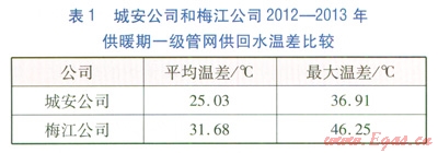 天津市城安熱電有限公司(以下簡(jiǎn)稱城安公司)和天津市梅江供熱公司(以下簡(jiǎn)稱梅江公司)2012—2013年供暖期一級(jí)管網(wǎng)供回水溫差比較見表1。由表1可知,城安公司一級(jí)管網(wǎng)供回水溫差與梅江公司差距較大。