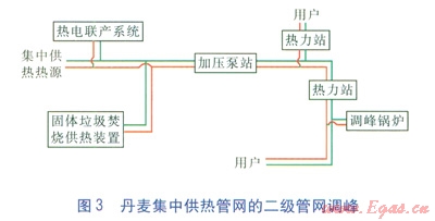 二級(jí)管網(wǎng)調(diào)峰多出現(xiàn)于東歐國(guó)家,比如丹麥集中供熱管網(wǎng)的調(diào)峰鍋爐設(shè)置(見圖3)就很有代表性[1-3]。