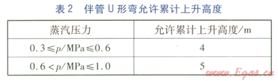由于被伴管常采用U形補(bǔ)償,以及受到安裝現(xiàn)場實際條件制約,伴管出現(xiàn)U形彎是不可避免的。U形彎的出現(xiàn)將增加伴管的阻力,易產(chǎn)生氣阻和液阻。因此,《規(guī)范》對伴管U形彎允許累計上升高度進(jìn)行了規(guī)定,見表2。