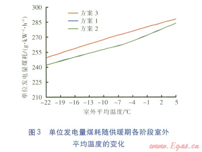 供暖期按180d計(jì)算,供熱系統(tǒng)采用分階段改變流量的質(zhì)調(diào)節(jié)方式。單位發(fā)電量煤耗(發(fā)電煤耗為總煤耗扣除發(fā)電機(jī)組汽輪機(jī)抽汽熱量折算煤耗、熱泵機(jī)組回收的小汽輪機(jī)排汽余熱折算煤耗、發(fā)電機(jī)組汽輪機(jī)乏汽余熱折算煤耗)隨供暖期各階段室外平均溫度的變化見圖3。由圖3可知,由于方案1、2利用了工藝余熱,單位發(fā)電量煤耗明顯小于方案3。方案1、2的單位發(fā)電量煤耗非常接近,由于乏汽余熱品質(zhì)略高于小汽輪機(jī)凝汽器冷卻水,因此方案2的單位發(fā)電量煤耗略低于方案1。