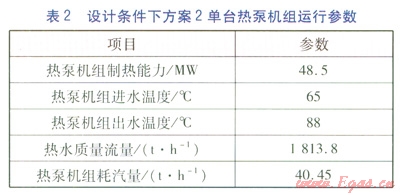 由于熱泵機(jī)組低溫?zé)嵩礊榉ζ?,熱泵機(jī)房宜設(shè)置在空冷島附近,且機(jī)房占地面積不宜過大,選擇2臺制熱能力為48.5MW的熱泵機(jī)組,3臺換熱能力為45MW的汽—水換熱器。方案2的運(yùn)行策略與方案1一致,設(shè)計(jì)條件下(室外溫度為-22℃),方案2單臺熱泵機(jī)組運(yùn)行參數(shù)見表2。
