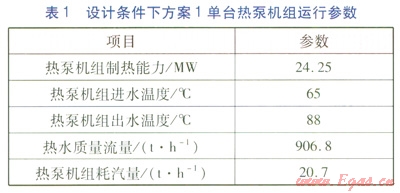 方案1的運(yùn)行策略為:初末寒期采用熱泵機(jī)組單獨(dú)供熱,汽—水換熱器不啟動,當(dāng)熱泵機(jī)組出水溫度不能滿足要求時(shí),啟動汽—水換熱器對熱泵機(jī)組出水進(jìn)行加熱。配置4臺制熱能力為24.25MW的熱泵機(jī)組,3臺換熱能力為45MW的汽—水換熱器。設(shè)計(jì)條件下(室外溫度為-22℃),方案1單臺熱泵機(jī)組運(yùn)行參數(shù)見表1。