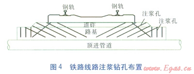 頂進(jìn)管道管底為承載力較低的淤泥質(zhì)粉質(zhì)黏土,結(jié)合本工程地下水豐富的特點(diǎn),需要對(duì)基底進(jìn)行注水泥漿液或AB型漿液加固。通過(guò)漿液的膠結(jié)、填充等作用,提高土層的內(nèi)聚力,并封堵地下水。加施工場(chǎng)地內(nèi)管線固后需采用雷達(dá)探測(cè)儀檢測(cè)其密實(shí)度,并且加固后的地基應(yīng)滿足承載力不小于100kPa的要求。注漿方式以地面注漿為主,路基內(nèi)采用斜注漿至設(shè)計(jì)高程。最后密封注漿孔。