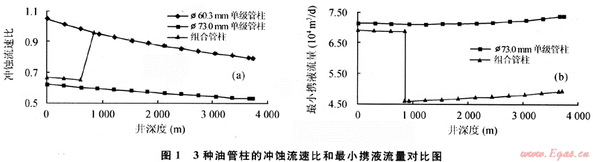 對(duì)Ø73.0mm單級(jí)油管柱、Ø60.3mm單級(jí)油管柱和Ø73.0mm×850m+Ø60.3mm×2880m兩級(jí)油管柱分別進(jìn)行計(jì)算沖蝕流速比,計(jì)算結(jié)果見圖1。