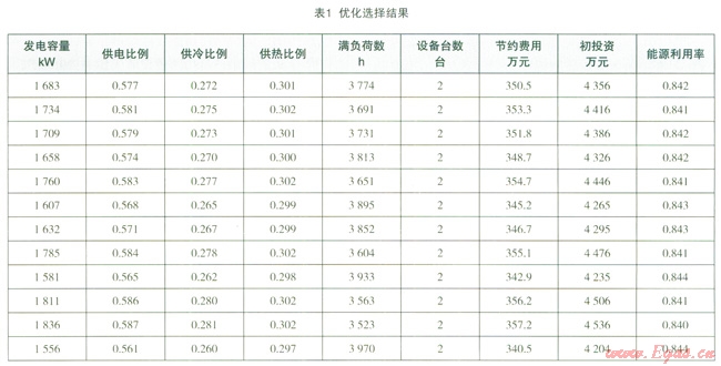 以10萬m2酒店建筑為例,采用分布式能源系統(tǒng)優(yōu)化計(jì)算軟件,綜合考慮能源利用效率、節(jié)約運(yùn)行費(fèi)用、初投資、機(jī)組滿負(fù)荷時(shí)數(shù)等因素后,得到的不同發(fā)電容量下的方案排序如表1所示。