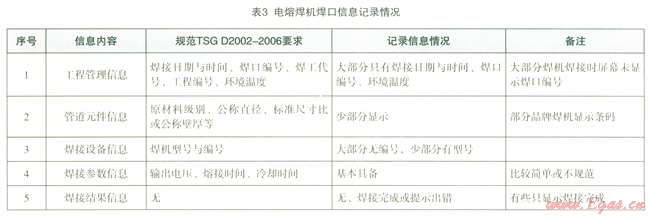 在焊口信息記錄方面,各品牌電熔焊機都具有數(shù)據(jù)檢索存儲功能,配置相應(yīng)的輸出接口(數(shù)據(jù)下載或打印接口),存儲容量高于標(biāo)準(zhǔn)和規(guī)范要求(不少于250個)。但是,與全自動熱熔焊機一樣存在信息不規(guī)范或不全的問題。對于具有可追溯性的焊口信息來說,應(yīng)至少包括工程管理、管道元件信息、焊接設(shè)備信息、焊接參數(shù)信息和焊接結(jié)果信息等5個方面。如表3所示,不少焊機記錄的焊口信息過于簡單和不規(guī)范。這既與目前相關(guān)標(biāo)準(zhǔn)和規(guī)范對此要求不夠具體有關(guān),又與對焊口信息對焊接工程管理重要性認(rèn)識不足有關(guān)。