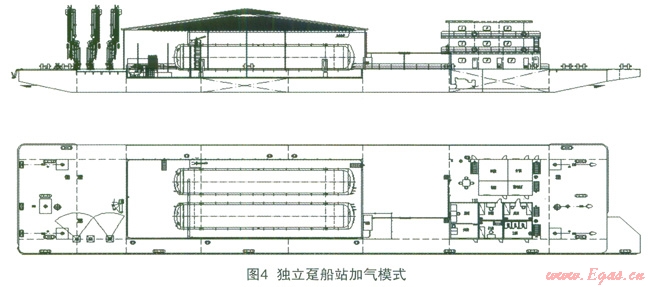 青島市即將投運的300萬t/a董家口LNG接收碼頭,為青島市大力發(fā)展LNC市場提供了供氣保障。通過市場調(diào)查,船舶加油一般采用岸基加油站加油、船基(躉船)加油站加油、加油船加油以及油罐車臨時加油四種形式。大型船舶以加油船加油居多,近海漁船一般采用加油車加油。我們認(rèn)為,在國家相關(guān)的港口建設(shè)加氣站以及加氣船尚未出臺有關(guān)規(guī)范前,近海漁船改用天然氣后,其加注形式仍然可以借鑒柴油的加注形式,利用移動加注車臨時加氣。同時,借鑒國內(nèi)其他城市已有的加注方案,作業(yè)時認(rèn)真做好防范措施,確保安全萬無一失。待國家相關(guān)規(guī)范形成后,適時建設(shè)船只專用加氣站確保供氣。我們了解了長江之上已經(jīng)改裝的船只加氣情況,并通過設(shè)備廠商了解了加氣站建設(shè)方案,認(rèn)為對海上船只在港口加氣有著較強(qiáng)的參考價值[3],建站方案見圖1~圖4。