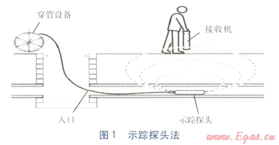 示蹤探頭法(見圖l)主要用于探查有出入口的非金屬管道。該方法是將能發(fā)射電磁信號的示蹤探頭通過穿管設(shè)備,從管道開口處穿入拉管管道內(nèi),在地面上用接收機(jī)接收示蹤探頭發(fā)射的信號,對拉管管道進(jìn)行準(zhǔn)確定位[5]。只要具備良好的接地條件,此方法就能有效避免常規(guī)示蹤線法探測存在的弊端,不易受周邊管線、介質(zhì)干擾,能較大程度保證拉管管道的探測精度。采用該方法具有探測結(jié)果能準(zhǔn)確提供拉管管道的三維空間位置數(shù)據(jù)及探測數(shù)據(jù)可作為拉管管道施工驗收依據(jù)兩點(diǎn)意義。