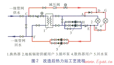 熱力站一級(jí)側(cè)供、回水溫度為100、60℃,改造前熱力站二級(jí)側(cè)(僅有地板輻射供暖用戶)供、回水溫度為50、40℃,擬增加的散熱器用戶供回水溫度為80、60℃。改造前后熱力站工藝流程分別見圖1、2。由圖1、2可知,改造后,散熱器用戶一部分供水由換熱器二級(jí)側(cè)供水管道引出,另一部分供水由換熱器一級(jí)側(cè)供水管道引出。由一級(jí)側(cè)供水管道引出的熱水經(jīng)減壓閥、電動(dòng)調(diào)節(jié)閥后,與由二級(jí)側(cè)供水管道引出的熱水混合,作為散熱器用戶的供水。散熱器用戶回水與地板輻射供暖用戶回水混合后,一部分回到換熱器二級(jí)側(cè)回水管道,另一部分回到一級(jí)側(cè)回水管道。改造后二級(jí)側(cè)補(bǔ)水可由一級(jí)側(cè)補(bǔ)充,因此二級(jí)側(cè)原有補(bǔ)水裝置(補(bǔ)水泵、水處理裝置等)可取消。回水泵流量與管道CD流量一致。經(jīng)校核,新增散熱器用戶的流量未超出循環(huán)泵的裕量,不影響地板輻射用戶流量。