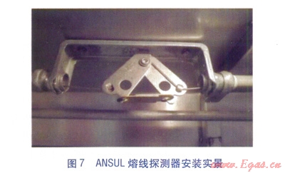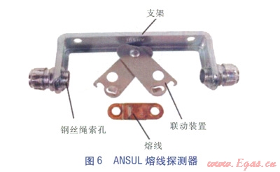 ④熔線探測器(見圖6)。熔線探測器布置在保護(hù)區(qū)的上方,通過額定溫度的合金熔線進(jìn)行自動(dòng)探測,當(dāng)溫度超過額定溫度時(shí),熔線斷開,鋼絲繩索松開。其安裝圖見圖7。