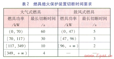 在工程實(shí)踐中,要求在燃具的每個(gè)燃燒器上都設(shè)置獨(dú)立的熄火保護(hù)裝置。另外,熄火保護(hù)裝置從檢測到?jīng)]有火焰到給出有效信號切斷燃?xì)夤?yīng)的整個(gè)操作過程必須是在安全合理的時(shí)間內(nèi),因?yàn)榇瞬僮鬟^程時(shí)間過長,燃具泄漏的燃?xì)膺^多,危險(xiǎn)性過高,保護(hù)裝置就失去了意義。對于不同類型及功率燃具的熄火保護(hù)裝置的最長切斷時(shí)間,澳門地區(qū)的相關(guān)燃?xì)夥ㄒ?guī)要求見表2。