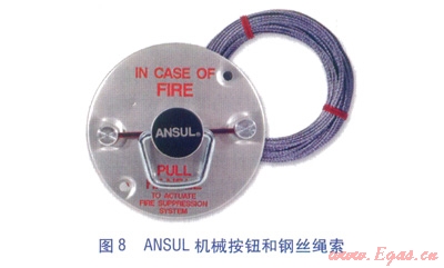 ⑤機(jī)械按鈕(見圖8)。是手動(dòng)啟動(dòng)滅火系統(tǒng)的操作工具,通過鋼絲繩索管連接到釋放裝置。機(jī)械按鈕拉環(huán)設(shè)計(jì)成允許三個(gè)手指操作,并有紅色字樣標(biāo)志,方便快速辨認(rèn)。