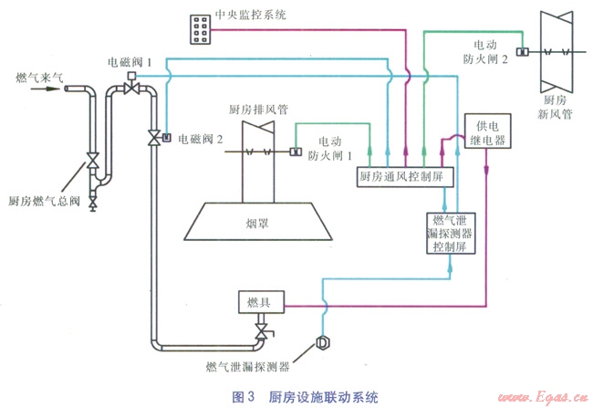 由于在商業(yè)廚房內(nèi)安裝燃?xì)庠O(shè)施種類及數(shù)量較多,需要防止燃?xì)庑孤?,同時(shí)在廚房火災(zāi)發(fā)生時(shí),若有燃?xì)庵紕t火災(zāi)更加難以控制,造成的災(zāi)難更大?;诎踩珳?zhǔn)則,工程實(shí)踐中,通常在商業(yè)廚房的燃?xì)饪傞y的下游設(shè)置一組電磁閥,與燃?xì)庑孤┨綔y器、廚房通風(fēng)管道內(nèi)的電動(dòng)防火閘、供電繼電器聯(lián)動(dòng)。當(dāng)燃?xì)庑孤┨綔y器偵測到泄漏發(fā)生時(shí),發(fā)出報(bào)警,電磁閥關(guān)閉、電動(dòng)防火閘關(guān)閉、供電繼電器切斷廚房燃具電源。由上述設(shè)備組成的廚房聯(lián)動(dòng)系統(tǒng)同時(shí)切斷了可燃物燃?xì)?、助燃物空氣的供?yīng)以及消除可能存在的點(diǎn)火源。電動(dòng)防火閘的關(guān)閉則更是可以遏制火災(zāi)經(jīng)通風(fēng)管道向其他地方蔓延。廚房設(shè)施聯(lián)動(dòng)系統(tǒng)見圖3。
