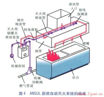 ANSUL廚房自動(dòng)滅火系統(tǒng)的工作原理如下:廚房著火導(dǎo)致布在廚房保護(hù)區(qū)(即灶臺、煙罩及其排風(fēng)管入口附近等火災(zāi)危險(xiǎn)區(qū))的探測器熔線斷開,引發(fā)連接在探測器上的鋼絲繩索松開,滅火劑釋放裝置啟動(dòng),打開動(dòng)力氣筒,釋放出高壓氣體進(jìn)入滅火劑儲罐,把滅火劑壓出并通過釋放管道輸送至噴嘴噴向保護(hù)區(qū),同時(shí)釋放裝置控制鋼絲繩索關(guān)閉機(jī)械切斷閥。ANSUL廚房自動(dòng)滅火系統(tǒng)的組成見圖4。