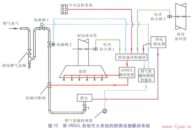 對于基于燃?xì)庑孤┨綔y的聯(lián)動(dòng)的缺陷,我們不敢掉以輕心,經(jīng)過與設(shè)計(jì)團(tuán)隊(duì)中消防工程師進(jìn)行深入的探討,以及咨詢?nèi)季邚S商的專業(yè)意見,針對商業(yè)廚房的特性,在進(jìn)一步的工程實(shí)踐中,在廚房增設(shè)ANSUL自動(dòng)滅火系統(tǒng),燃?xì)夤?yīng)系統(tǒng)與之聯(lián)動(dòng),而不僅僅是設(shè)置電磁閥與燃?xì)庑孤┨綔y器。