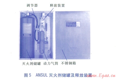 ②調(diào)節(jié)型釋放裝置。屬于一種裝有彈簧的機(jī)械、氣動(dòng)釋放裝置,配置一個(gè)儲存二氧化碳或氮?dú)獾膭?dòng)力氣筒,向滅火劑儲罐提供動(dòng)力氣供應(yīng),氣筒上安裝有調(diào)節(jié)器,氣筒的密封層設(shè)計(jì)成由釋放裝置擊穿。釋放裝置由熔線探測系統(tǒng)進(jìn)行自動(dòng)啟動(dòng),釋放裝置還可以通過鋼絲繩索連接設(shè)置在保護(hù)區(qū)以外的機(jī)械按鈕進(jìn)行遙控手動(dòng)開啟,另外可與大廈中央監(jiān)控系統(tǒng)的連接線兼容,將有關(guān)信號自動(dòng)傳輸?shù)酱髲B中央監(jiān)控系統(tǒng)。ANSUL滅火劑儲罐及釋放裝置見圖5。