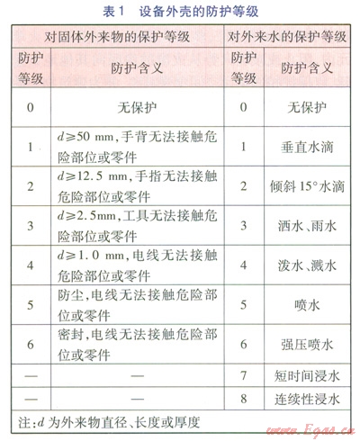 國際防護(hù)符號IP,即Ingress Protection Rating(防護(hù)等級),或International Protection Rating(國際保護(hù)等級),表示裝置外殼的防護(hù)等級,由IP和后續(xù)的兩位數(shù)字組成。第一個(gè)數(shù)字為0~6,表示對固體外來物的保護(hù)等級,第二個(gè)數(shù)字為0~8,表示對外來水的保護(hù)等級,數(shù)字越大表示防護(hù)等級越高。國際電工技術(shù)委員會(huì)(International Eleetroteehnical Commission,IEC)標(biāo)準(zhǔn)IEC 529《外殼所提供的保護(hù)等級》(Degrees of Protection Provided by Enclosure)的相關(guān)規(guī)定見表1。