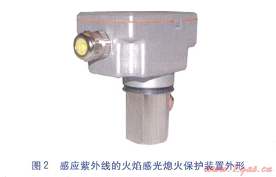 火焰感光熄火保護(hù)裝置利用火焰的光特性,采用感光式電子火焰?zhèn)鞲衅?,吸收火焰輻射?qiáng)度高的紅外線或紫外線,來探測或掃描火焰。代表火焰信號的初始電流經(jīng)放大后推動(dòng)執(zhí)行繼電器。該類型熄火保護(hù)裝置的特點(diǎn)是探測器分辨火焰輻射來獲得正確的火焰信號,不需要接觸火焰,配置探頭變得很簡單。不需要火焰電極,探頭在高溫下不退化。另外,由于所有熱的物質(zhì)都向外輻射紅外線,感應(yīng)紅外線的火焰檢測裝置存在缺點(diǎn),即難以區(qū)分究竟是火焰輻射還是燃燒室受熱表面輻射(即使火焰熄滅),因此火焰檢測裝置的設(shè)計(jì)優(yōu)選感應(yīng)紫外線。感應(yīng)紫外線的火焰感光熄火保護(hù)裝置見圖2。