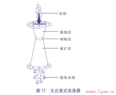 文丘里式洗滌器(見圖l2)由三段組成:漸縮段、咽喉段和漸擴(kuò)段。把油煙氣流壓入文丘里式洗滌器,當(dāng)油煙進(jìn)入漸縮段后,流速增大,進(jìn)入咽喉段時(shí)達(dá)到最大值。洗滌液噴霧則從咽喉段加入,將其清洗。在漸擴(kuò)段,流速減小,壓力回升,油煙粒子凝聚成直徑較大的液滴,進(jìn)而被收集。