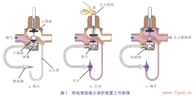 熱電偶熄火保護(hù)裝置的工作過程如圖l所示。當(dāng)燃具不工作時(shí),下閥塞關(guān)閉主燃?xì)馔?span lang="EN-US">(如圖1a)。當(dāng)按下點(diǎn)火按鈕時(shí),下閥塞打開,上閥塞關(guān)閉,燃?xì)馔ㄟ^點(diǎn)火管,燃具點(diǎn)火,同時(shí)鐵片與電磁鐵貼緊,點(diǎn)火火焰將熱電偶加熱,產(chǎn)生電動(dòng)勢,使電磁鐵得磁而吸住鐵片(如圖lb)。此時(shí)放開按鈕,上下閥塞均打開,主燃?xì)馔方油?,燃具正常工?span lang="EN-US">(如圖1c)。當(dāng)火焰意外熄滅時(shí),熱電偶冷卻,電動(dòng)勢消失,電磁鐵失磁,鐵片脫落,下閥塞在彈簧作用下關(guān)閉氣路(如圖la)。