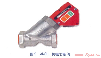 ⑥機(jī)械切斷閥(見圖9)。安裝于廚房燃?xì)饪傞y下游燃?xì)夤艿郎希?dāng)ANSUL系統(tǒng)啟動(dòng)時(shí),機(jī)械切斷閥由鋼絲繩索控制而關(guān)閉,切斷廚房燃?xì)夤?yīng),經(jīng)手動(dòng)復(fù)位。