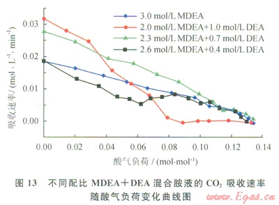 圖l2為不同配比MDEA+DEA混合胺液的CO2吸收速率變化曲線,圖l3為不同配比MDEA+DEA混合胺液的CO2吸收速率隨酸氣負(fù)荷變化曲線。如圖l2、13所示,隨吸收反應(yīng)的進(jìn)行、酸氣負(fù)荷的增加,4種配比MDEA+DEA混合胺液的CO2吸收速率逐漸降低,最終趨近于0,MDEA/DEA配比為2.6/0.4混合胺液的CO2吸收速率變化趨勢(shì)與MDEA胺液非常接近。按初始時(shí)刻CO2吸收速率由大到小的MDEA/DEA配比順序?yàn)?span lang="EN-US">2.0/1.0、2.3/0.7、2.3/0.4、3.0/0.0、2.0/1.0、2.3/0.7,這2種配比混合胺液的CO2吸收速率隨時(shí)間降低趨勢(shì)較為劇烈,吸收達(dá)到平衡的時(shí)間較短;2.3/0.7配比混合胺液在同一酸氣負(fù)荷下的CO2吸收速率始終高于MDEA單一胺液;2.0/1.0配比混合胺液在酸氣負(fù)荷較低時(shí)保持較高水平的CO2吸收速率,但隨著酸氣負(fù)荷的增大迅速降為0。