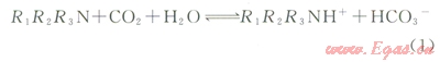 MDEA屬于叔胺,分子式表示為R1R2R3N,其中R1=CH3-、R2=R3=CH2CH2OH-。MDEA與CO2反應(yīng)生成亞穩(wěn)態(tài)的碳酸氫鹽,總反應(yīng)式為[8-9]: