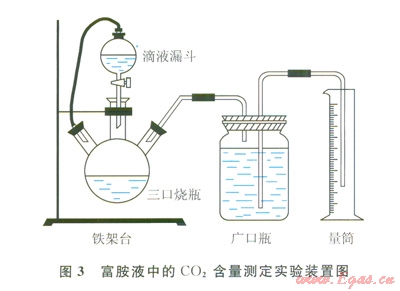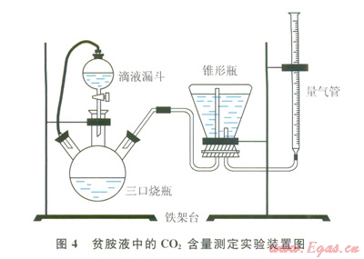 圖3、4分別為富胺液、貧胺液中的CO2含量檢測(cè)裝置,胺液樣品中CO2含量使用酸解法測(cè)得坫]。酸解法主要利用強(qiáng)酸置換弱酸的原理,用強(qiáng)酸H2SO4將CO2從胺液中置換出來(lái),通過(guò)測(cè)定放出的CO2氣體體積計(jì)算溶液對(duì)CO2的吸收量。