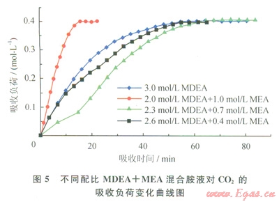 2)MDEA/DEA配比為2.0/1.0時(shí)CO2吸收反應(yīng)很快達(dá)到平衡,但該配比在酸氣負(fù)荷較高的條件下CO2吸收速率較低;MDEA/DEA配比為2.6/0.4的混合胺液較MDEA,一胺液對(duì)CO2的吸收性能并無(wú)改善作用;2.3/0.7配比的MDEA+DEA混合胺液對(duì)CO2的吸收負(fù)荷與CO2吸收速率均保持較高水平。