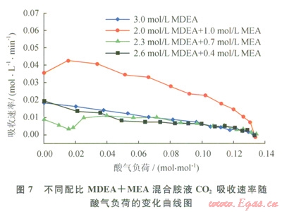 圖6為不同配比MDEA+MEA混合胺液CO2吸收速率的變化曲線圖,圖7為不同配比MDEA+MEA混合胺液CO2吸收速率隨酸氣負(fù)荷的變化曲線。從圖6、7可以看出,不同配比MDEA+MEA混合胺液隨吸收反應(yīng)的進(jìn)行,酸氣負(fù)荷逐漸增大,CO2吸收速率逐漸減小至0。MDEA/MEA配比為2.0/1.0的混合胺液CO2吸收速率明顯高于其他配比混合胺液;MDEA/MEA配比為2.3/0.7和2.6/0.4的混合胺液CO2吸收速率變化趨勢(shì)非常接近,與MDEA單一胺液CO2吸收速率相差不大。由此說(shuō)明,2mol/L的MDEA溶液中加入1mol/L的MEA,其CO2吸收性能顯著提高,MEA添加量較小時(shí)對(duì)MDEA的CO2吸收性能并無(wú)改善。因此,MEA作為MDEA的添加劑時(shí),需要較高MEA/MDEA配比才能使混合胺液表現(xiàn)出更好的CO2吸收性能。