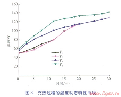 蒸汽蓄熱器是利用水的單位體積焓遠(yuǎn)大于蒸汽的特性而設(shè)計(jì)的間接存儲蒸汽的貯熱裝置,其中的水既是蒸汽和水進(jìn)行熱交換的傳熱介質(zhì),又是蓄存熱能的載熱體[1]。蒸汽蓄熱器的蓄熱(充熱)過程是鍋爐供給的高壓蒸汽直接與蒸汽壓較低的飽和水的混合傳熱過程。充熱裝置是蒸汽蓄熱器的一部分,見圖l。充熱過程中,工作蒸汽通過充汽分配管進(jìn)入蒸汽噴射系統(tǒng),均勻噴射入蓄熱器水空間,使蓄熱器內(nèi)水溫、水位和焓逐漸升高。充熱過程終止時(shí),蓄熱器內(nèi)儲存與充汽分配管等蒸汽壓的飽和水及與其相應(yīng)的焓,同時(shí)水位達(dá)到與充汽分配管底部平齊[4]。充熱過程要力求高壓蒸汽通過噴嘴盡量充分、快速、均勻地溶入到飽和水中,這要求盡量強(qiáng)化水循環(huán)的湍流擾動。傳質(zhì)傳熱的程度和速度直接影響飽和水空間溫度場及蒸汽壓力與水飽和蒸汽壓之間的偏差,由此造成不可逆內(nèi)部熱損失隨充熱時(shí)間的增加而增加。充熱過程動態(tài)特性曲線見圖2、3。