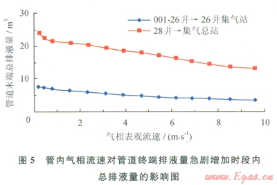 2)對管道終端總排液量的影響。清管過程中2條管道終端在排液量急劇增加時段內(nèi)的總排液量如圖5所示。由圖5可知,不同氣相流速對清管過程中管道終端排液量急劇增加時段內(nèi)總排液量的變化將產(chǎn)生顯著影響。隨著管內(nèi)氣相流速的增大,管道終端總排液量呈現(xiàn)逐漸遞減的趨勢,這是由于隨著管輸量的增加,管內(nèi)氣流速度增大,氣體的攜液能力增強(qiáng),管內(nèi)總積液量減少,因而清管過程中管道終端總排液量也將減少。