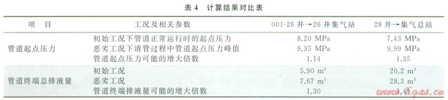由表4與圖8、9可知,當(dāng)管內(nèi)氣相流速與氣液比均減小時,清管過程中管道的起點壓力峰值和終端排液量均將增大,但不同管道的增大幅度并不一致,體現(xiàn)出的基本規(guī)律為:管道越長或高程差越大,清管中管道的起點壓力峰值和終端排液量增大幅度越大。其中,對管道較長高程差較大的28井®集氣總站管道而言,在管道運(yùn)行到后期可能遇到的惡劣工況下清管過程中管道起點壓力將比管道運(yùn)行初期正常運(yùn)行工況下的起點壓力增大1.35倍,而終端排液量則比管道運(yùn)行初期清管過程中的排液量增大1.41倍。