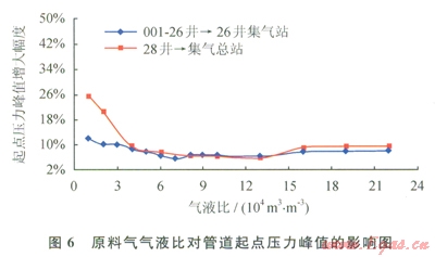 1)對管道起點壓力的影響。2條管道在不同原料氣氣液比下的管道起點壓力峰值變化情況如圖6所示。由圖6可知,原料氣氣液比也對清管過程管道起點壓力的變化具有重要影響,即:當(dāng)原料氣氣液比低于4×10m3/m3時,清管過程中管道起點壓力峰值則隨原料氣氣液比的減小而快速增大,尤其當(dāng)原料氣氣液比小于1×104m3/m3后,清管過程中的管道起點壓力峰值將增大到正常生產(chǎn)工況下管道起點壓力的l.1~1.3倍。