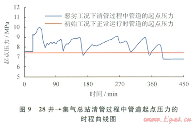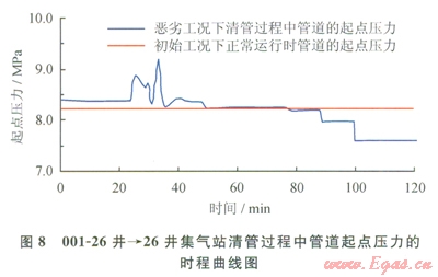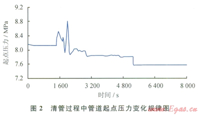 為簡化起見,僅以001-26井®26井集氣站氣液混輸管道實際清管作業(yè)為例,分析清管過程中管道起點壓力、管道終端液體流量等工況參數(shù)的變化規(guī)律。