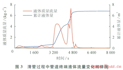 清管過程中管道終端液體瞬時質(zhì)量流量和累計液體量這2個參數(shù)是設(shè)計終端段塞流捕集器的基礎(chǔ)依據(jù),圖3給出了001-26井®26井集氣站管道清管過程中終端液體流量變化規(guī)律。由圖3可知,管道終端液體瞬時質(zhì)量流量會隨著清管時間發(fā)生劇烈波動,最大值約為7kg/s,可能會超過管道終端段塞流捕集器設(shè)計尺寸而出現(xiàn)溢流現(xiàn)象,特別是對于高含硫氣液混輸管道,其積液中存在高含量H2S等劇毒物質(zhì)可能會對周圍環(huán)境造成安全風(fēng)險。此外,通過模擬管道終端累計液體體積流量,可得出管道在清管過程中排液急劇增大時段內(nèi)的總排液量,可為管道終端段塞流捕集器容量設(shè)計提供參考。
