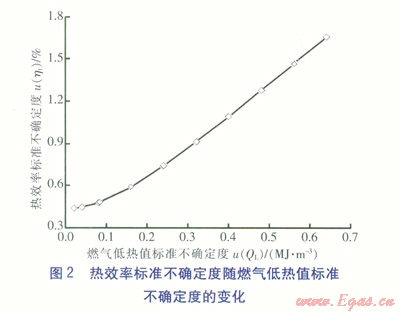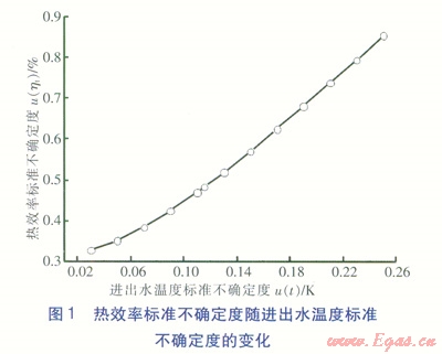 在所有輸入量標準測量不確定度中,由于進出水溫度的標準不確定度以及燃氣低熱值的標準不確定度對熱效率的標準不確定度的影響最大,因此有必要對兩者進行深入分析。在分別改變進出水溫度標準不確定度、燃氣低熱值標準不確定度條件下,對熱效率標準不確定度的變化進行計算(見圖1、2)。由圖1、2可知,進出水溫度標準不確定度、燃氣低熱值標準不確定度的改變對熱效率標準不確定度的影響很大。