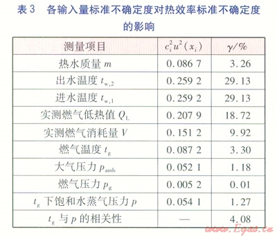 以表2為例,所有輸入量中,實測燃氣消耗量、熱水質(zhì)量的靈敏系數(shù)最高,但是由于其測量的標準不確定很小,總體上來說,對熱效率的不確定影響不是很大。出水溫度tw,2、進水溫度tw,1、實測燃氣低熱值QL無論是靈敏系數(shù)還是標準不確定度都較大,其對測量結(jié)果的不確定度影響最大。