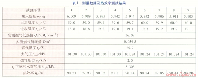選取一臺額定熱功率為20kW的熱水器,燃氣種類為12T天然氣。執(zhí)行GB 6932—2001對測試的要求,對熱水器進行熱效率的測定。共進行9次測試,測量數(shù)據(jù)及熱效率測試結(jié)果見表1。