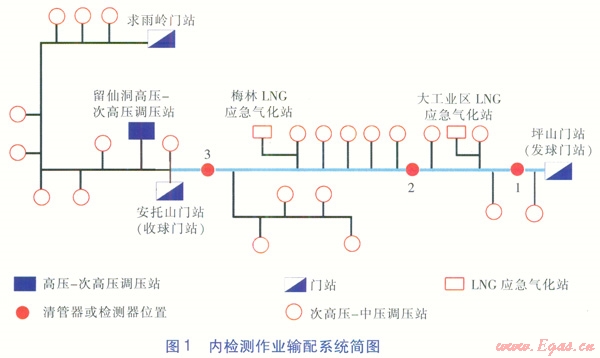 調(diào)度中心收集、匯總現(xiàn)場(chǎng)信息,計(jì)算分析清管器或檢測(cè)器實(shí)時(shí)速度,調(diào)整供氣門(mén)站、LNG應(yīng)急氣化站的流量,有效控制球速,滿足內(nèi)檢測(cè)作業(yè)的工藝要求。預(yù)測(cè)清管器或檢測(cè)器通過(guò)各分輸支線及收球門(mén)站的時(shí)間,提前通知廠站現(xiàn)場(chǎng)指揮組做好相應(yīng)操作準(zhǔn)備。通過(guò)調(diào)整清管器或檢測(cè)器的發(fā)球時(shí)間和速度,避免在供氣高峰時(shí)段關(guān)停重要的調(diào)壓站而影響下游供氣。在清管器或檢測(cè)器卡堵的應(yīng)急情況下,進(jìn)行管網(wǎng)運(yùn)行工況調(diào)整及供氣保障的氣量調(diào)度。