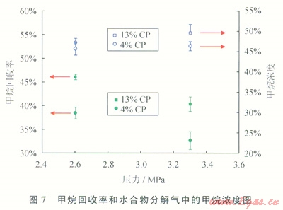 圖7給出了低甲烷濃度煤層氣的甲烷回收率(Methane Recovery)和水合物分解氣中CH4濃度(Methane Concentration)隨壓力的和環(huán)戊烷濃度的變化情況。由圖7可見,在p=2.6MPa的低壓條件(Dp=2.3MPa)、13%CP的甲烷回收率最高,約為46.1%。水合物分解氣的CH4濃度在各實(shí)驗(yàn)條件下較為接近,約為47.2%。