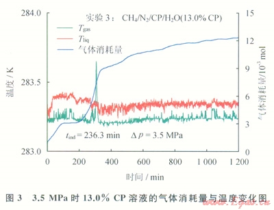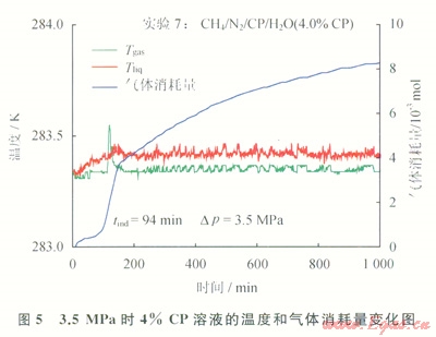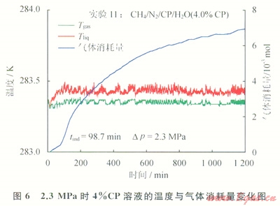 圖5給出了Dp=3.5MPa時(shí),低甲烷濃度煤層氣在4%CP溶液中生成氣體水合物情況。當(dāng)反應(yīng)開始94min后,氣相溫度突然升高,氣體消耗量從1.0×10-3mol快速升高到3.6×10-3mol。圖6給出了低甲烷濃度煤層氣在Dp=2.3MPa、4%CP溶液中生成氣體水合物情況。與圖5的結(jié)果類似,當(dāng)反應(yīng)開始98.7min后,氣體消耗量從1.1×10-3mol突然增加到3.2×10-3mol,表明水合物此刻在環(huán)戊烷—水界面開始結(jié)晶并生長。